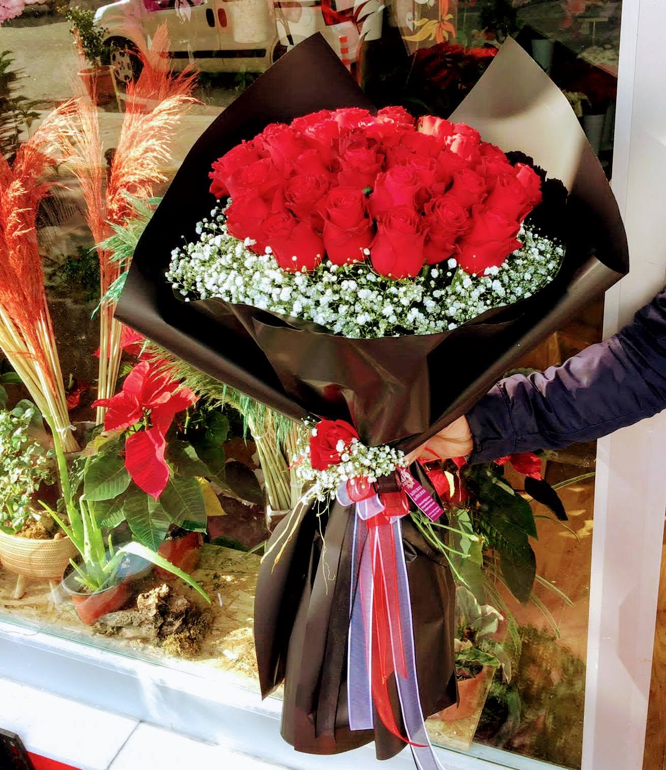 30 Adet Kırmızı Gül ve Cipsolardan Oluşan Siyah Pakette Söz Nişan Buketi