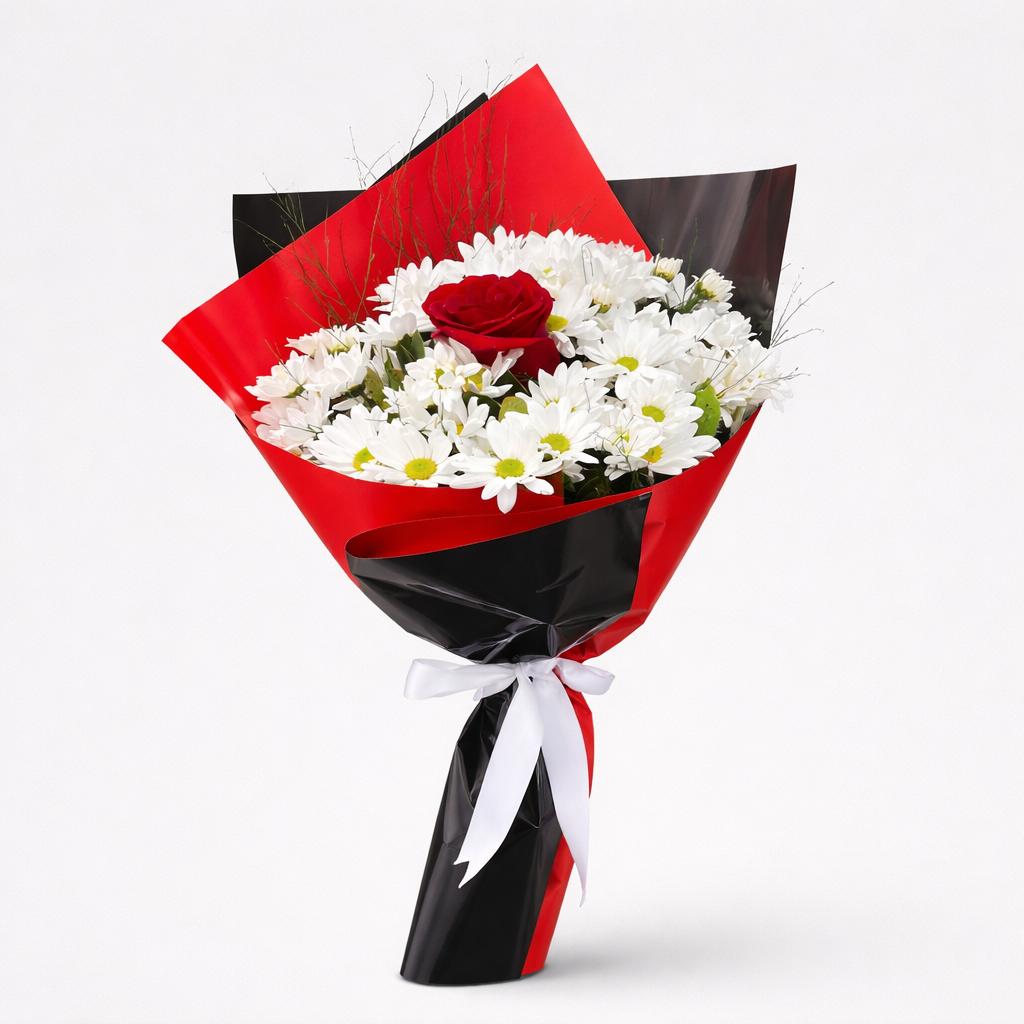 1 Demet Papatya ve 1 Adet Kırmızı Gülden hazırlanan çiçek buketi